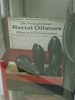 Some of the most notable exhibits are the full-sized models, built by Glore, of treatment devices from the 16th, 17th, and 18th centuries.[1] One such item is a "Tranquilizer Chair", complete with hood, hand and feet restraints and a built-in portable toilet to accommodate extended sessions.[2][5] The chair was invented by Benjamin Rush, known as "The Father of American Psychiatry", who published the first American textbook about mental illness in 1812.[5]