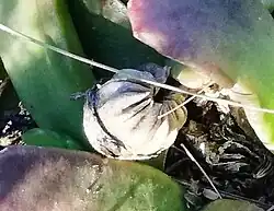 The seed capsule has a very soft, round, spongy base, and thick valves raised up in a high (>3 mm) rounded dome shape at the top. The capsule's surrounding rim is low and depressed. The stalks of the capsule disintegrate rapidly, allowing the capsule itself to fall. The rounded capsule then rolls and spreads the seed further (tumble fruit).