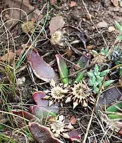 Discarded seed-capsule. After they fall, the rounded capsules roll and spread seed further (tumble-fruits).