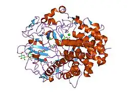 Glycoside hydrolases EC 3.2.1. are a widespread group of enzymes that hydrolyse the glycosidic bond between two or more carbohydrates, or between a carbohydrate and a non-carbohydrate moiety. A classification system for glycoside hydrolases, based on sequence similarity, has led to the definition of >100 different families.[1][2][3] This classification is available on the CAZy web site,[4][5] and also discussed at CAZypedia, an online encyclopedia of carbohydrate active enzymes.[6][7]