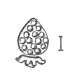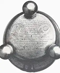 The diameter at the top is 12 centimetres, and the cup stands on three soldered balls that raise the cup by about two centimetres. The outside of the cup is decorated with engravings. These are beautifully drawn and elaborate arabesque ornaments. Three oval medallions show different subjects and are captioned to the story below. Further text and two coats of arms are found on the underside of the cup; they are those of André Falquet and the city of Augsburg. A lid completes the piece. It consists of an undecorated closing rim and a quarter-round decorated rim; separated by an almost flat intermediate piece, a cone with a little crown and a sphere at the top rises from it. The cup is made of gilded silver. Except for the feet and the medallions, the gilding is complete. The total height of the cup is 22 centimetres and it weighs 552 grams.[1]