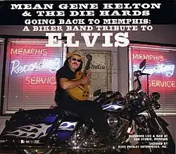 Going Back To Memphis: A Biker Band Tribute To Elvis is the third album[1] for "Mean" Gene Kelton and the Die Hards. It was released in 2007 by JamBone Records. It contains 13 songs that are licensed by Elvis Presley Enterprises in Los Angeles, California.[2] All thirteen songs were recorded in a row, live and raw, just like at a motorcycle rally. Only the harmonica and background vocals were dubbed in. The CD was recorded, mixed, and mastered in one marathon session on the night of June 23, 2007, at Sun Studio in Memphis, Tennessee.