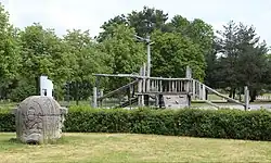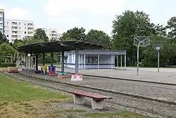 The Goldschmiedplatz is a multifunctional open space for leisure and residential activities. The centre is formed by the Blauer Punkt (Blue Point), the 25 m2 tram house managed by a residents initiative of the Diakonie Hasenbergl with the roofing of the former stop. A number of private and public events take place here, such as a regular flea markets or the Hasenbergl-Nord residents get-together. There is also a barbecue area, a viewing platform and a climbing playground for children. There is also a community garden supervised by Green City. For sporting activities, a volleyball court, table tennis, two chess fields, a boules court, a summer curling track and a large skate park are integrated into the surrounding park. Here you will also find a sculpture by Hanns Goebl and the Hasenbergl Monument, which commemorates the electoral hunt in the 18th century.[4][5][6]