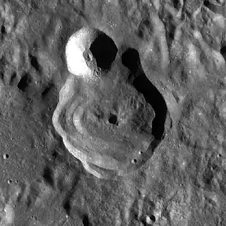 Golitsyn is a lunar impact crater that lies beyond the western limb on the far side of the Moon. It is located in the southwestern portion of the Montes Rook mountain range that forms one of the rings around the Mare Orientale impact site. The crater is situated in the midst of rugged, irregular terrain that contains only a handful of other significant craters.