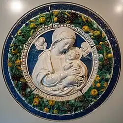 At the time of the Renaissance, Florence was a producer of polychrome glazed ceramic, which arrived to Spain through the continental trade. One example of this type of ceramic is a 17th-century Florentine tondo depicting Madonna and Child, attributed to the manufacture of Benedetto Buglioni’s workshop.