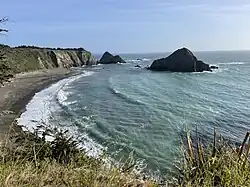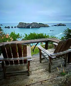 A new sawmill was built c. 1953 and another followed in 1963. These operated until the late 1960s, when the redwood and Douglas fir was mostly logged out (which means that the ancient trees big enough to be thought of as more valuable dead than alive had been killed). After some quiet times, the town has had a rebirth[4] as a recreation destination particularly as a result of the pandemic with people wanting to get out of the urban areas.[5] A couple of the larger old houses are now bed and breakfast inns, and the state has acquired Greenwood State Beach and the original mill site as a state park. The ZIP Code is 95432. The community is inside area code 707.