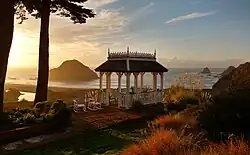 Elk was originally called "Greenwood," after the Greenwood brothers,[2] early homesteaders and sons of mountain man Caleb Greenwood and his half-Crow wife, one of the rescuers of the Donner Party. When the post office was opened, in 1887,[2] there was already another Greenwood in California so it was called Elk Post Office. Eventually the name came to refer to the town. It is an outgrowth of an earlier town called Cuffy's Cove and the cemetery is located at that townsite 1 mile (2 km) north of Elk. When pioneer lumberman Lorenzo White was unable to reach a satisfactory deal with the owners of the lumber chutes at Cuffy's Cove to ship out his redwood product, he constructed a wharf out along a string of rocks in the center of what is now Elk. When he built a large steam sawmill and 3-foot (90 cm) gauge railroad, the new employment drained the town of Cuffy's Cove, which was eventually abandoned. The sawmill was producing 80,000 board feet (200 m3) of lumber per day by 1890. The mill was sold to Goodyear Redwood Company in 1916. Elk River Company took over the sawmill when Goodyear went bankrupt in 1932. The local redwood lumber industry economy collapsed when the uninsured sawmill burned in 1936.[3]