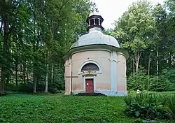 The Słownik geograficzny Królestwa Polskiego states that, historically, theatrical performances were staged at "the beautiful castle of the Hebersteins" three times a week for eight months of the year, and that the place was known for its "steam baths". The village had a Catholic church, and a chapel dedicated to St. Anthony surmounting a hill of the same name, which rises to the height of 1,053 feet above sea level. The location is described as "utterly exquisite" (prześliczne położenie).[5]