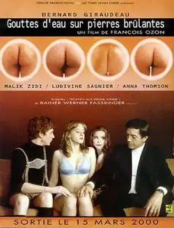 Water Drops on Burning Rocks (French: Gouttes d'eau sur pierres brûlantes) is a 2000 French romantic comedy drama film directed by François Ozon,[1] based on Rainer Werner Fassbinder's play Tropfen auf heißen Steinen.[2] The plot concerns a 50 year old businessman in 1970s Germany, who becomes infatuated with a man 30 years his junior.