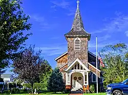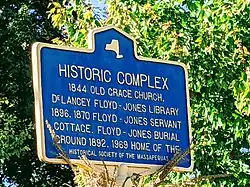The Grace Church Complex is a historic Episcopal church complex in Massapequa, Nassau County, New York. The complex consists of the church, surrounding parish cemetery, the Floyd-Jones family cemetery, and the DeLancey Floyd-Jones Free Library. The small church was built in 1844 by Elbert Floyd-Jones and remodeled in 1905. It is a frame structure on a brick foundation and consists of a vestibule, nave, and chancel. It is in the Gothic Revival style and features a square bell tower with modest spire. The church also has Tiffany glass windows added during the remodeling.[2] Sometime after 1983, the old Grace Church was given to the Historical Society of the Massapequas.