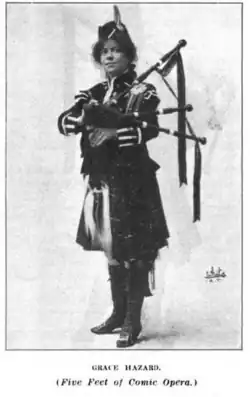 Hazard acquired a set of custom half-sized bagpipes in Scotland in 1908,[12] and learned to play them.[13] In February 1909 she was scheduled to perform "Five Feet of Comic Opera" at "The Greatest Scottish Concert Ever Given in America", at Carnegie Hall, with Harry Lauder headlining.[14] She also opened for Lauder in Chicago that year.[15]