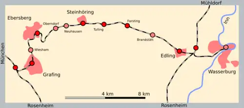 After about two kilometres the line reaches the centre of the town of Grafing at Grafing Stadt station. It then runs through some tight curves to the north through the hamlet of Wiesham, which once had a station, uphill to Ebersberg. Ebersberg station is located on a hill orientated in a west–east direction and it has two platforms, one of which is only accessible from the Grafing direction and is served only by the S-Bahn. The overhead line ends east of the station. The line has been laid over the next two kilometres in a large loop to the south to provide a reasonable slope to cope with the difference in height between Ebersberg station and the Ebrach river. Once the line has reached the bottom of the valley it runs to the east through Oberndorf bei Ebersberg and the hamlet of Neuhausen bei Ebersberg, both of which once had stations, before it reaches Steinhöring station.
