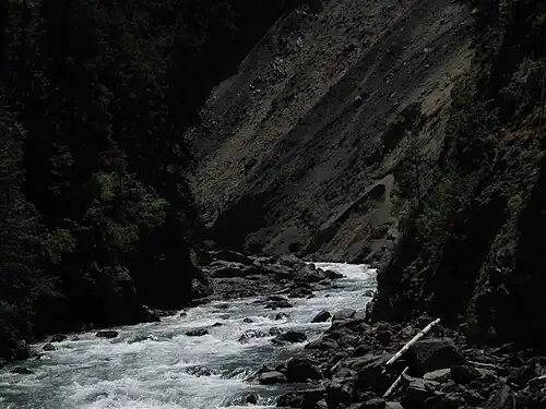 The Grand Canyon of the Elwha is a deep canyon on the Elwha River located below Dodger Point approximately 5 miles (8.0 km) upstream from the now-drained Lake Mills in Washington, United States. It can be reached approximately 3.5 miles (5.6 km) from the Whiskey Bend trailhead via the Geyser Valley trail. It is also about 12 mile (0.80 km) from Humes Ranch Cabin and 1.4 miles (2.3 km) from Goblins Gate.