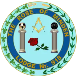 The seal of the lodge is a combination of images relevant to its identity and masonic connections. Bordering the seal are an ear of corn and a sprig of acacia, the ear of corn representing plenty and the sprig of acacia to represent Hiram Abiff, a central character within masonic history. Within the border is the name of the lodge and its warranted lodge number. The abbreviation for word number is not written as No. as would be expected but as Nr. showing its German heritage. Centrally placed are a red rose and the combined image of an architect's square & compasses. The rose, as the lodge name suggests, represents the Rose of Minden and the square & compasses is the most recognisable symbol within freemasonry. Two pillars are placed either side of the rose and square & compasses, these represent the two pillars placed outside of King Solomon's temple, again, key objects within masonic history. Atop the pillars are two spheres showing terrestrial and celestial maps representing that freemasonry is seen by masons as being universal.