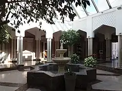 It combines traditional Maghreb architecture and calligraphy with a modern Western style. The façade is composed of Persian arches. The Mosque also boasts a 25-metre minaret. The entrance is covered by a glass pyramid that includes 230 columns.[3][4]