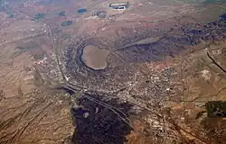 Aerial view of Grants in 2007. Black Mesa is above town, and to the west Grants adjoins Milan. Interstate 40 bends to avoid the mesa.