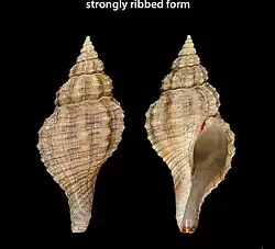 The shell is small and broadly spindle-shaped, sculpted with rounded axial ribs crossed by crisp spiral ridges, with fine intermediary spiral threads in between. Shell width and the prominence of axial ribs are variable. The siphonal canal is relatively short, and the inner lip is not strongly calloused. [2]