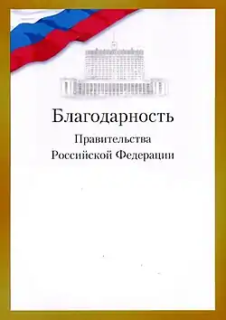 1. ^ "Government Decree of the Russian Federation No. 73 of January 31, 2009 "On the Certificate of Honour and Letter of Gratitude of the Government of the Russian Federation" (with amendments and additions)" (in Russian). base.garant.ru. January 31, 2009. Retrieved May 12, 2025.