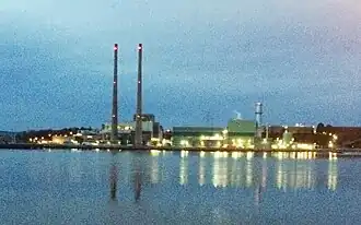 Great Island Power Station is a gas fired and former heavy fuel oil fired power station situated near Waterford Harbour in Great Island, County Wexford, Ireland, that supplies electricity to more than 500,000 Irish homes. It is located at the confluence of the rivers Barrow and Suir, near Campile. The station opened in 1967 and was operated by the Electricity Supply Board (ESB) with three heavy fuel oil units and a total power of 240 MW since 1972. The station was scheduled to close by 2010,[1][2] until it was sold to Endesa in January 2009.[3] In October 2012, the plant was acquired by SSE Thermal.