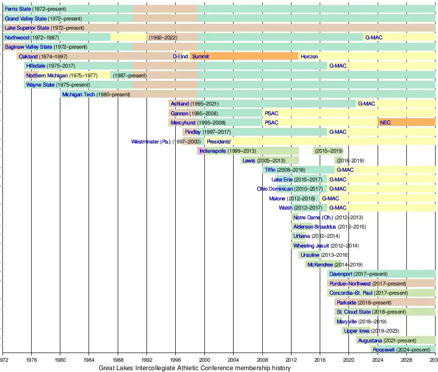 1. ^ "GLIAC Membership History". Great Lakes Intercollegiate Athletic Conference. Archived from the original on November 30, 2011. Retrieved October 29, 2011.