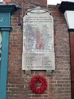 Two smaller stone memorial plaques in Great Missenden also honour local residents who died fighting in the world wars. A British Legion plaque is located at 52 High Street in Great Missenden, and another plaque is located inside the memorial hall on the Link Road. The memorial hall plaque was unveiled by the Lord Lieutenant of Buckinghamshire, Charles Wynn-Carington, 1st Marquess of Lincolnshire on 12 May 1921.[2][3] A grant of £411 was given to repair the High Street plaque by the War Memorials Trust in 2008 after the letters had become faint.[4]