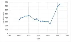 The total population of Great Moulton was at its lowest in 1961 with a total of 247,[18] where there was then it showed an increase of 500 people in 50 years, leading to 751 people living in Great Moulton to date.[19] When the census began in 1801, the population was at 354 residents, where it gently increased to the highest population prior to 2001, which was 1851 with a total population of over 450 people.[20]