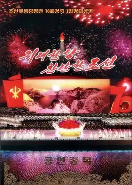 The 10 000 People Strong Grand Art Performance Celebrating the 70th Anniversary of the Workers' Party of Korea "Great Party, Rosy Korea"[1] (조선로동당창건 70돐경축 1만명대공연 《위대한 당, 찬란한 조선》[2]) was a one-off artistic performance held on the 11th of October 2015 in celebration of the 70th anniversary of the ruling Workers' Party of Korea. The performance was originally meant to be hosted on the evening of the 10th of October, however, this was moved back a day due to wet weather.[3]