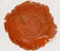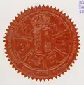 The letters-patent establishing the colony of Queensland as an entity separate from New South Wales granted the governor the authority to keep and use the "Great Seal of the Colony".[23] The only surviving depiction of the seal is a hand seal for wax impressions, which depicts Queen Victoria on the Coronation Chair.[24] It is held by the Queensland Museum. After federation, a new seal design was created, which depicted the coat of arms of the UK held by a lion, next to the coat of arms of Queensland held by a kangaroo, above a banana tree.[24] It was designed by Mr JW Purvis, a die maker and engraver following a public competition.[25] The inscription of the seal changed on the ascension of each monarch and the change of style of Queen Elizabeth II to Queen of Australia. The most current inscription reads "elizabeth the second by the grace of god queen of australia and her other realms and territories in the commonwealth".
