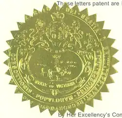 The seal of Victoria depicts the royal arms on the top half and sheep grazing on the bottom half. Inscribed around the outside is "Elizabeth II Dei Gratia Britanniarium Terrae Australis Regnorumque Suorum Ceterorum Regina, Consortionis Populorum Princeps, Fideo Defensor".[2]