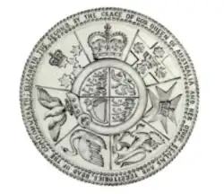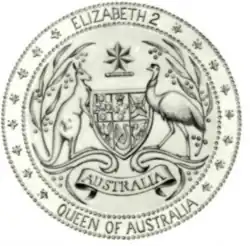 The next design was authorised by Elizabeth II on 19 October 1973 during another of her visits to Australia.[6] It featured the coat of arms of Australia, beneath the words Elizabeth the Second and above the words Queen of Australia.[10] The badge of South Australia was also changed back to a piping strike. On this occasion, the Queen also took on the style Queen of Australia, signifying the separate constitutional identity of the monarch from her role in other Commonwealth realms.[11] The design was chosen from the following proposals: