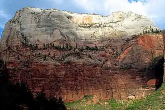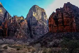 The Great White Throne[2] is a monolith, predominantly composed of white Navajo Sandstone in Zion National Park in Washington County in southwestern Utah, United States.[1] The north-west "main" face rises 2,350 feet (720 m) in 1,500 feet (460 m) from the floor of Zion Canyon near Angels Landing. It is often used as a symbol of Zion National Park. The Great White Throne can be seen from most locations along the scenic drive running through Zion Canyon.