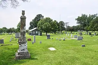 Greenwood Cemetery is a historic cemetery on West Main Street in Council Grove, Kansas. The cemetery opened in 1862; before then, all burials in Council Grove took place at the Kaw Mission's graveyard. A number of bodies were moved from the graveyard to the new cemetery once it opened. The local chapter of the Independent Order of Odd Fellows began managing the cemetery in 1870; the group platted the cemetery grounds and built a stone wall around it, the south side of which still stands. The Council Grove city government took over cemetery operations in 1911 and built the Shelter House, the cemetery's only building, in 1922. The city expanded the cemetery grounds in 1923 and 1945; in 1990, when all available plots had been sold, they opened a new cemetery. Most of Council Grove's early settlers and civic leaders are buried at Greenwood Cemetery, including Seth M. Hays, the city's first white settler.[2]