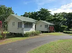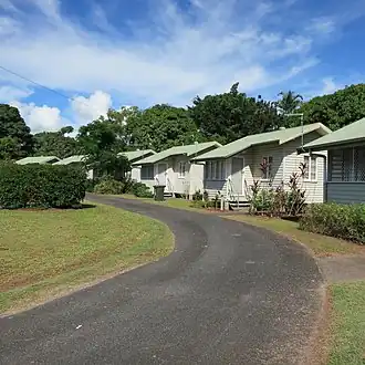 By September 1953, cottages had been built at Innisfail (11 units), Cloncurry (6 cottages), Inglewood (1 cottage), Texas (1 cottage), Warwick (8 cottages), Toowoomba (22 units), Mareeba (10 cottages), Ipswich (12 units), and Mackay (12 cottages under construction).[47] Other towns known to have carried cottage schemes through to completion include Maryborough, Atherton, Bowen and Blackall.[48][49][50][51][52] The types of accommodation constructed varied. In Toowoomba, eleven timber United States Army buildings were relocated to West Street and converted into duplex cottages, each housing two couples. This was one of the first schemes completed, with units available from December 1947.[53][54][55] In Innisfail, fibro-clad single and double units, and one four-unit cottage for women only, were built in different locations in the town so that the pensioners would be "part of the normal fellowship of suburban life".[47] In Mackay, a "model settlement" of 12 cottages and a communal laundry was designed by architect Karl Langer, built in a low, bungalow style serviced by a winding road.[56][57][58] In Cloncurry, six rectangular, concrete and brick cottages were constructed in a row on the edge of town.[59][60][61][62] While in Brassall, Ipswich, six double units, with tiled roofs and brick chimneys, were completed in 1953, each unit containing a bedroom, living room, kitchen, bathroom and verandah.[63][64] Cottages were let for an affordable rent, and pensioners interested in occupying them made an application to the local authority. Some schemes only permitted all males or all females to reside there, while others provided for mixed groups and married couples.[1]