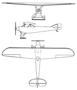 Its cantilever wing was straight-tapered, with no sweep on the leading edges, and with long, curved tips. It was built around two spars and was very thick centrally but thinned outwards; there was no dihedral on the upper surface but the thinning produced significant overall dihedral. Tapered ailerons filled about half the span. The wing was mounted over the fuselage on a cabane of four sloping metal struts to the front spar and another six to the rear.[1]