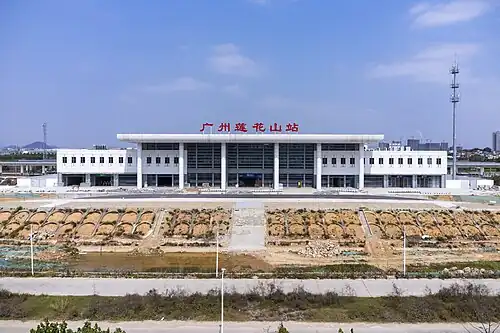 Guangzhou Lianhuashan railway station (simplified Chinese: 广州莲花山站; traditional Chinese: 廣州蓮花山站; pinyin: Guǎngzhōu Liánhuāshān Zhàn; Jyutping: Gwong2zau1 Lin4faa1saan1 Zaam6; lit. 'Guangzhou Lotus Hill station') is a station on Guangzhou–Huizhou intercity railway and Pazhou branch of the Guangzhou–Shenzhen intercity railway located in Panyu District, Guangzhou, Guangdong, China.[1][2] The station opened on 26 May 2024, and is operated by Guangdong Intercity Railway Operation Co., Ltd.[3][4][5]