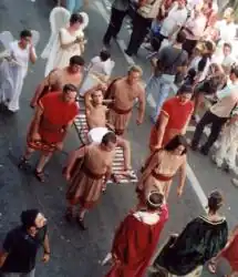 Each of the four quarters of the town forms a committee to organize a parade of "mysteries" (religious scenes), with volunteers in period costumes from the Old Testament, New Testament, and Lives of Saints. The neighboring towns of San Lorenzo Maggiore and San Lupo join with the committees to stage a few of the mysteries. In 2003, there were about one hundred mysteries in all. During the course of a week, each quarter of town holds a separate procession through its neighborhood. On Sunday, all four quarters form a single grand procession, with participants holding poses depicting particular moments of the mystery as they walk through town—they do not act out events. The committees informally compete with each other to put on the finest mysteries.