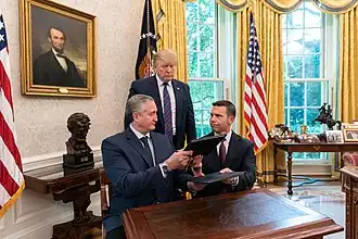 U.S. President Donald Trump watches as Guatemalan Minister of the Interior Enrique Degenhart (left) and U.S. Acting Secretary of Homeland Security Kevin K. McAleenan (right) sign an agreement on Cooperation Regarding the Examination of Protection Claims in 2019