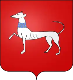 Arms of Fouquet de la Varenne : "Gules, a sighthound statant argent, with a collier of France"