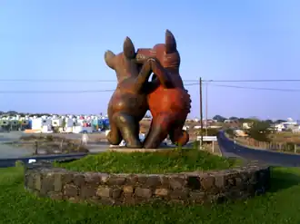 His restoration specialty are figures from the shaft tombs found in western Mexico.[2] Most of his reproduction work is that of Colima area pre Hispanic pottery. He makes figures of birds, priests and men and women in various activities, as well as monkey figures found only in Colima, but his most popular works are those of xoloitzcuintles or Mexican hairless dogs.[3] The most famous Mesoamerican era image of these dogs is falsely called “the dancing dogs” but in reality is a depiction of an older dog passing on generational information to the younger.[4] Ríos Alcalá created a monumental version of this piece which stands at a traffic circle in the city of Colima, on the highway to Comala.[2]