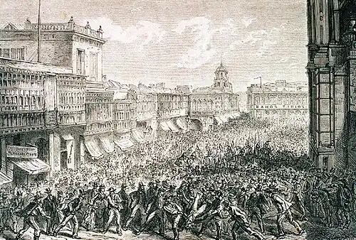 The mob took over the Government Palace at 5:30 in the afternoon. While Marcelino took refuge in a friendly house at Mariquitas street,[6] Tomás, recklessly, fled through the streets of Lima, with his face covered and wearing a civilian hat, shouting "Viva Pardo" with the intention of going unnoticed. To his bad luck, he ran into a group of officers who recognized him immediately. Upon being arrested, he claimed that he had been incited to rebel by prominent politicians and military men, who abandoned him and claimed to know nothing of the assassination of President Balta. They advanced a few blocks, while they were followed by a mob that shouted threats, and when they reached the La Merced square, the soldiers who arrested him could not protect him any further and hid him in a pharmacy, immediately closing the doors. The crowd broke through the doors and searched for Tomás, whom they found hiding in a tub. He was then shot dead, and his body taken out to the street. There, the corpse was undressed and shot, as well as slashed across the chest by an unknown man, who was alleged to have said, alluding to the presidential sash: "You want a sash? Take your sash."[1]