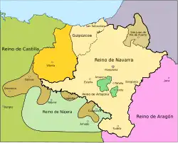 Gutierre held several important fiefs (tenencias) from the crown, mainly in eastern Castile, near the frontier with Navarre. On account of his court attendance and military activities, his supervision of these territories must usually have been indirect.[18] His first major tenancy was Calahorra, a city that had once been a part of Navarre and which was located just north of the Navarrese town of Tudela. He replaced Count Rodrigo Martínez—his co-envoy to Sayf al-Dawla in 1131—as fief-holder in Calahorra in 1140.[19] There is ample evidence of Gutierre's methods of indirect rule in Calahorra. As early as 26 February 1140 he had appointed one Martín Fernández his alcalde[d] (mayor or local magistrate). A private charter of 1 March 1142 cites a four-person council (the alcaldes de concejo) sharing in the government of Calahorra.[37] Martín Fernández was probably a relative of Gutierre's, from the house of Ansúrez. Eight private documents between 1 April 1139 (probably mis-dated) and 1151 cite Martín as tenant (tenens) or vicar (vicarius) of Calahorra under Gutierre.[18] Gutierre continued to hold Calahorra down to at least 27 February 1152.[19][38] The next tenant, Fortún López, had been appointed by 6 July 1152.[39] He may have been a confidante of Gutierre,[19] and had previously held the city under the rule of Alfonso I of Aragon and Navarre until 1134.[39]
