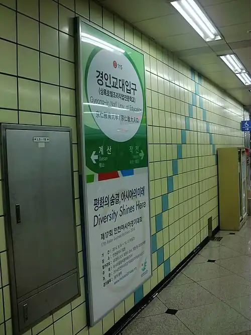 Gyeongin National University of Education Station is located at Gyeyang district of Incheon in South Korea. The station was opened in 1999 of which the name was Incheon National university of education station. In 2003, the term was changed following the alteration of university. The university changed its name into Gyeongin National University of Education.