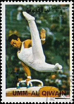 ![]() Umm al-Quwain stamp depicting gold medalist Sawao Kato on the pommel horse | ||||||||||