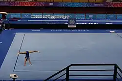 41 gymnasts competed in the floor exercise event in the artistic gymnastics qualification round on August 16. The eight highest scoring gymnasts advanced to the final on August 21.