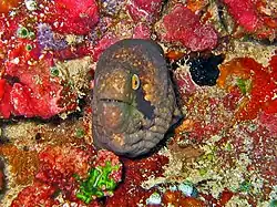 The blackcheek moray eel is a medium-sized fish that can reach a maximum length of 100 cm,[5] but usually morays observed are often smaller.[6] The background body color is brown speckled in a relatively high density with darker spots. This moray is easily identifiable by the large irregular black patch mark (hence the common name of blackcheek moray eel) starting from the eye and finishing in the corner of the mouth. Otherwise, its anal orifice and its gills aperture are black.[5][7][8]