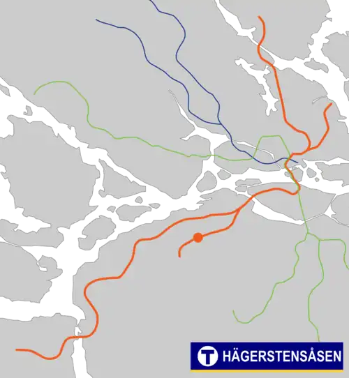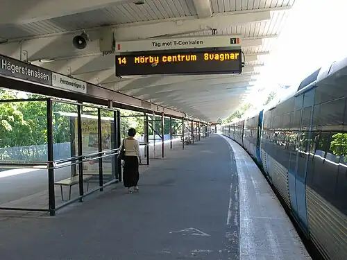 Hägerstensåsen metro station is a station on Line 14 in the Stockholm metro, located in the district of Hägerstensåsen. The station was opened on 5 April 1964 as part of the first stretch of Metro 2, between T-Centralen and Fruängen.[2]