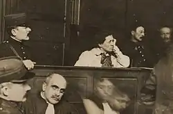 Brion was the first woman in France to be tried by a military tribunal during World War I. Her trial became a cause célèbre, reported on the front pages of the national newspapers.[15] The trial took place in March 1918. The charges were based on a law of 5 August 1914 that prohibited publications that would give information to the enemy or would exercise a bad influence on the mind of the army and the people. Brion was co-accused with Mouflard, a soldier who was her godson and was suspected of having circulated pacifist propaganda at the front. The debates lasted several days, and many witnesses were brought for the defense. Character witnesses included Séverine, Jean Longuet, deputy and grandson of Marx, Marthe Bigot, a teacher who said she had distributed the same material as Brion and therefore deserved the same punishment, Nelly Roussel, vice president of the Union fraternelle des femmes and others. The defense stated that the offending leaflets were not illegal and had been openly circulated for a long time without the authorities taking any action.[1] Brion questioned the validity of the trial, saying,