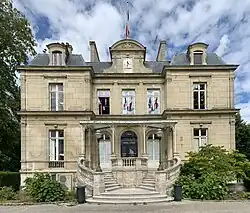 The southern part of the park was acquired by a local ironmaster, Jules Mathieu Lagoutte, who went on to be the local mayor,[3] and who commissioned a house there in the mid-19th century. It was designed in the neoclassical style, built in ashlar stone and was completed in 1853. The design involved a symmetrical main frontage of five bays with the outer bays projected forward as pavilions. The central section of three bays featured a forestair leading up to three round headed doorways. There were three casement windows with cornices on the first floor and, above the central bay, there was a clock flanked by pilasters supporting a segmental pediment. The outer bays were fenestrated by casement windows with cornices on the first two floors and by dormer windows at attic level. After Lagoutte died in 1899, his heiress, Madame Puech, divided the property up and sold the house to the town council in 1903. The new town hall, and the landscaped municipal space around it, was officially opened on 2 July 1905.[4][5]