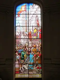 The new central section featured a short flight of steps leading up to a segmental headed opening, which was flanked by two round headed windows. There were three squared-headed windows with cornices and a wide balcony on the first floor, and three plain square-headed windows on the second floor. The windows on the upper floors were flanked by four Ionic order columns supporting an entablature, a modillioned cornice and a balustraded parapet. The parapet was surmounted by a central clock which was flanked by pilasters supporting an open pediment containing a coat of arms. The outer sections were fenestrated by rounded headed windows on the ground floor and by square headed windows on the upper floors. Behind the clock, there was a steep roof which was surmounted by a square lantern with finials. Internally, the principal new rooms included a Salle des Mariages (wedding room) on the first floor of the new central section. A stained-glass window, depicting a crowd of local people gathered to hear the reading of the municipal charter granted by Henry I, Count of Champagne in 1179, was installed at the head of the grand staircase.[8][9] Fine marble floors depicting serpents intertwined to create the letter "M" were created by the Italian artist, Henri Bichi, and installed in many of the rooms.[10]