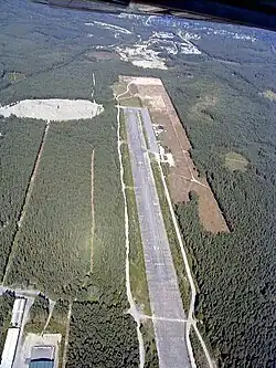 Luftwaffe soon took an interest in the airport plans and planning started in 1941. However, construction did not commence before 1943. A forest area 200 hectares (490 acres) was expropriated from Egge Farm and 200 Norwegians were hired to cut down the forest. Under the command of Erwin Keller, further construction was carried out by a combination of Organisation Todt, prisoners of war and Norwegian contractors.[3] The plan for construction was extensive and was planned as one of the largest airports in Norway.[4] This included a runway, a dummy runway on the other side of the Randsfjorden Line, a taxiway and hardened aircraft shelters, among others.[5] The airport was completed in September 1944, by which time it had received an 1,800-by-60-meter (5,910 by 200 ft) runway. It also had landing lights and an instrument landing system, as well as a Lorenz radar.[6]